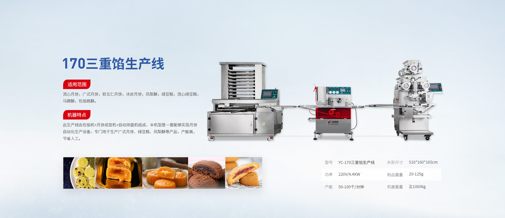 適用范圍:可適用于:烘焙類產品、魚漿類產品、早餐類產品、蒸煮類產品d等,另可生產四重包餡產品如:四重流心月餅、漸變色流心月餅、雙色和果子、金鑲玉月餅。